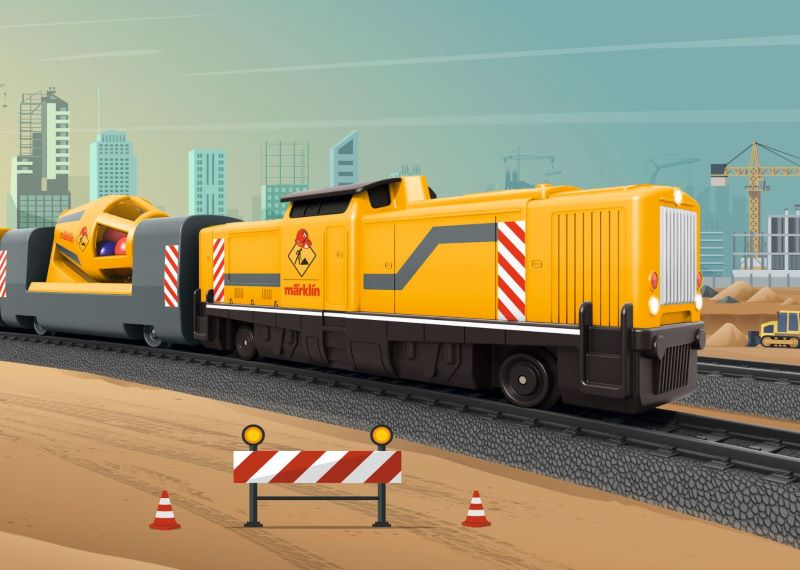Model: Construction site train with construction site sounds and a horn. Fast charging with a rechargeable battery and USB charging cable. Easy to use operation for children thanks to the Marklin Power Control Stick. A cement mixer with a rotating mixer and colourful balls as a load. A dump car with a dumping tub that can be tipped for loading and unloading. Power shovel as an accessory. Different sounds and light functions included. A construction site station is available under item number 72222 to accessorize this set. This set can be expanded with the 23300 plastic track extension set.