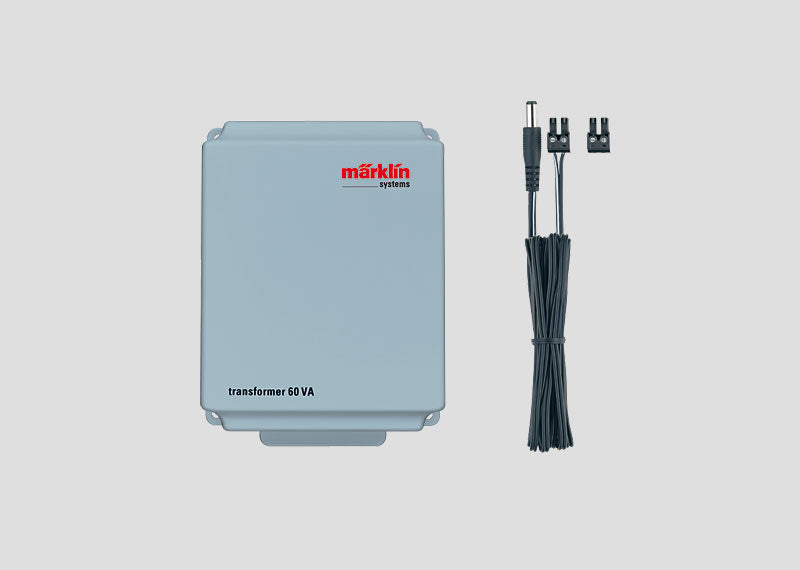 Transformer for supplying power to the 60652 Mobile Station. For operation with 120 volt household current. This transformer has a new connection socket and a power cord with a plug. This transformer can be used for to supply power for conventionally controlled Märklin solenoid accessories. 16 volt AC output. Plastic housing.