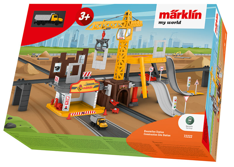 Model: The Construction Site Station offers many different play options - the highlight is the large crane in the center of the construction site station. A construction site vehicle, a fast start ramp for vehicles, windows that can be turned, construction site walls that can be moved, a bowling alley, and other functions bring endless fun for creative playing to the theme of a construction site. The two building halves can be positioned in different angles using a pivot point. One possibility is to use the track for the Marklin My World elevated rairoad in combination with the construction sit station. The building can be combined with different and multiple track patterns at the same time by using the different variations for connections to the track on Level 0 and Level 1. A sheet of stickers and assembly instructions are included. Batteries are included. The Fire Station comes in individual pieces. Dimensions: 77 cm / 30-5/16" long x 45 cm / 17-3/4" wide x 33 cm / 13" high.