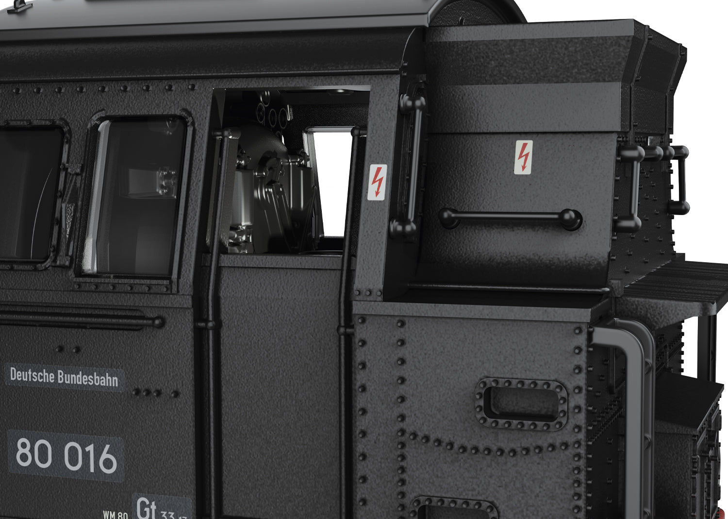 Prototype: German Federal Railroad class 80 tank locomotive. This is a version with three boiler domes, a bell, and a turbo dynamo on the left, a smokebox door without a central lock with the number sign in the middle. Deep black basic paint scheme. Road number 80 016. The locomotive looks as it did around 1953.