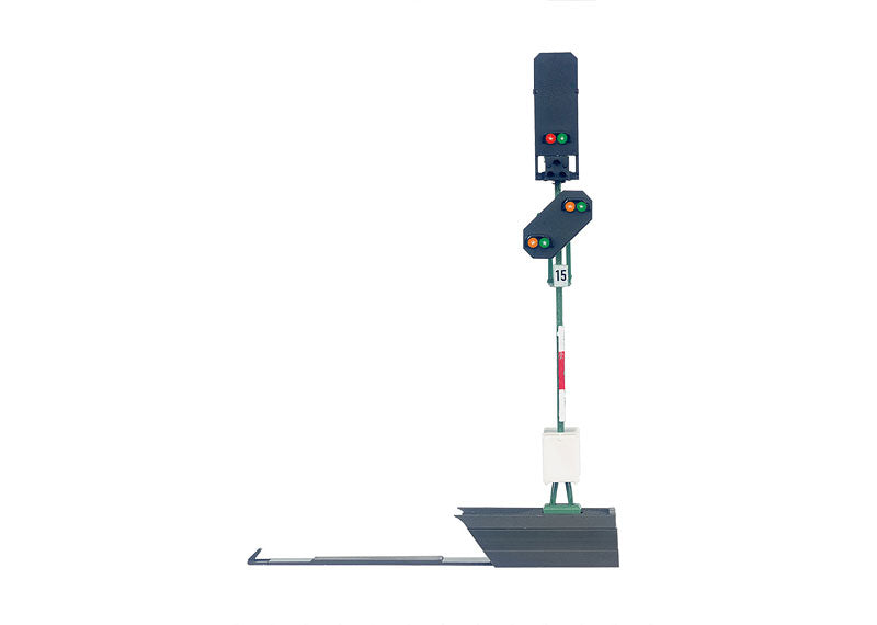 Model: The signal has 2 built-in electronic signal circuits and 1 separate signal decoder. The distant signal can be used for all home signals. Control of all functions is possible in the digital system with the signal decoder included with the signal, or in conventional operation with a 72760 control box. The signal decoder can be installed under C Track or under the layout. For digital operation, the configuration and the address can be assigned and tested before the installation of the signal. Connections for controlling train movements and for 1 additional distant signal are on the signal decoder. Height without base 78.0 mm /3-1/16".