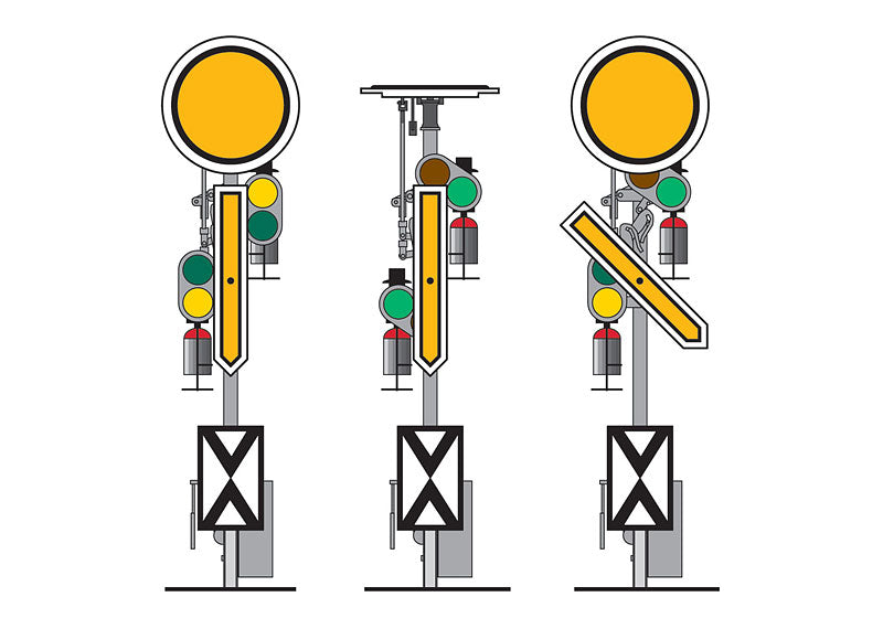 The signal has a movable arm and movable disk. The signal changes from yellow/yellow to green/green or to yellow/green. It has 2 servos.