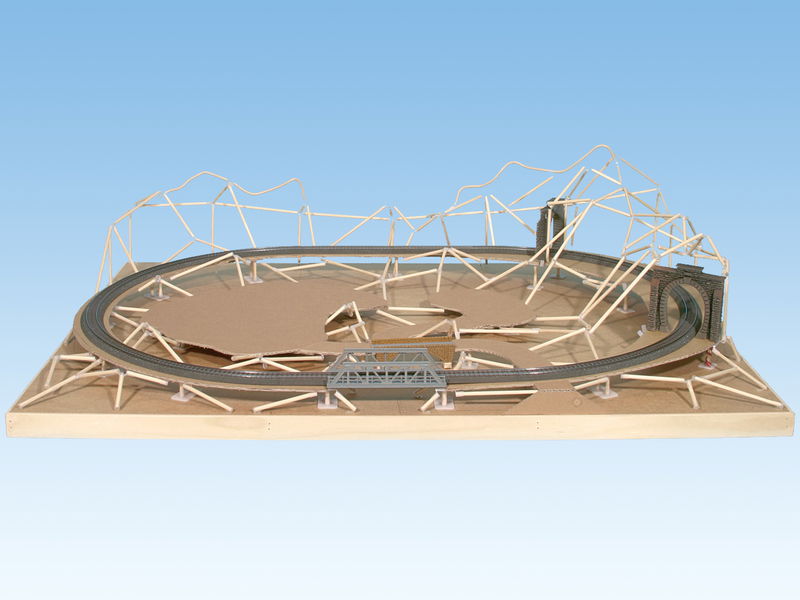 After a test drive, you start designing the landscape - over and around the track layout. The first thing you do is set up the tent-like framework. Since the round poles are only inserted into the connecting elements, the structure can be corrected and changed at any time. With this framework system, a subsequent redesign is just as easy as the ongoing "maintenance" of the rails and the entire technology. When the framework is in place, it is then covered with NOCH Landscape Crepe Paper and now forms your "blank terrain", which you can further develop according to your wishes.