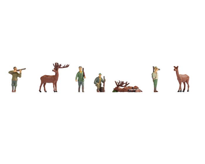 The set for H0 scale (scale 1:87, approx. 2 cm high) includes four hunters with rifles and three deer.