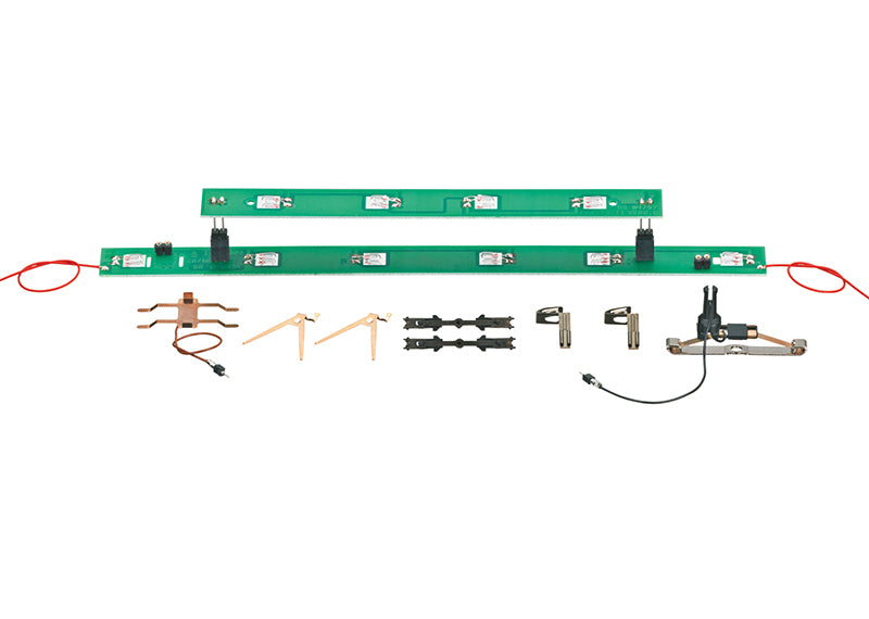 For cars 43581-43586. The kit consists of a pickup shoe and a ground spring, a circuit board with 10 light bulbs, and a current-conducting coupler.