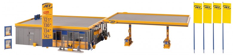 Modern JET filling station with a partly glazed shop and a pump island with a large flying roof. The kit includes display boards, an air/water/cleaning station, advertising flags and banners and numerous other decorative parts. Suitable for Car System operation with truck, bus and car models. For optimal lighting of the model, use "2 LED bar spotlights", Art. 180648.