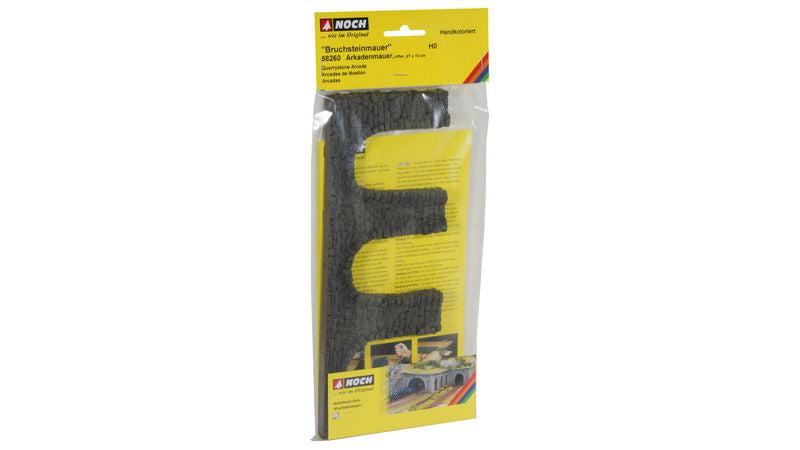 The open "arcade wall" made of hard foam is perfect as an ornament in a city scene at a railroad station and next to beautifully designed half-timbered houses. The realistically reproduced "arcade wall" from the hard foam quarry stone wall series fits perfectly into any landscape design on your model landscape.