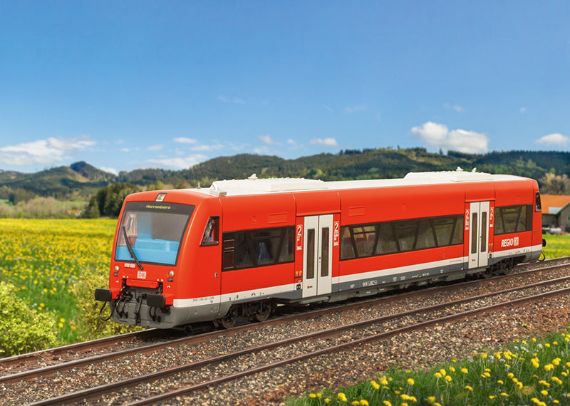 Prototype:German Railroad, Inc. (DB AG) type Regio Shuttle RS1 class 650 diesel powered rail car. Version with prototype couplers, buffers, and train destination signs mounted above. Traffic red basic paint scheme. Road number 650 020-0. The rail car looks as it did starting in 2015.
