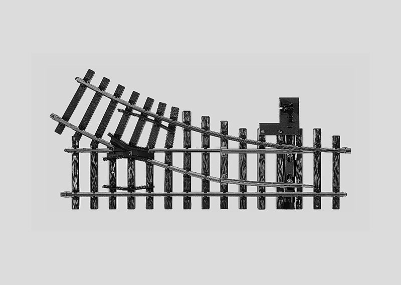 Manual hand lever included. Spring-loaded switch rails. Turnout angle 30°. Branch radius 600 mm / 23-5/8". Length of the straight side 300 mm / 11-13/16". The manual hand lever for 5965, 5966, 5976 and 5977 can be mounted on the right or left side or can be replaced by the 5625 electric turnout mechanism.