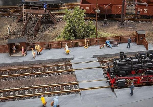 Access only with a valid ticket! Platform barrier consisting of lattice fencing, small waiting shelters for the passengers and a roofed booth for a railway employee. Both timber elements of the model are manufactured by the laser-cut process.