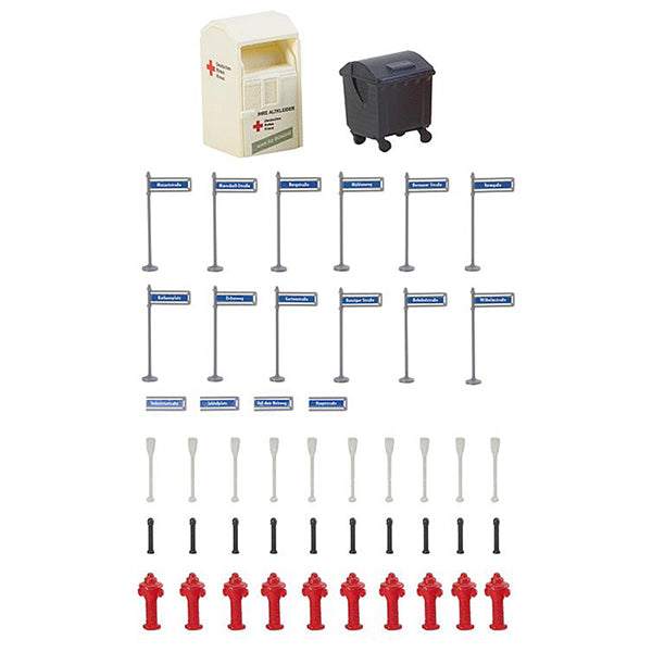 Bring life to your scenes left and right of the road. This great accessory set includes various parking meters, iron posts, hydrants, a garbage container and a large number of street signs with freestanding poles as well as street signs for attaching to outer walls.