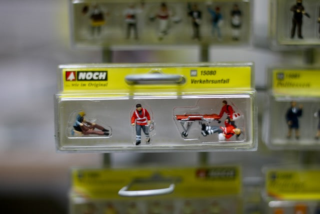 The Figures Set in H0 gauge contains six figures and a stretcher. Two paramedics are pushing the stretcher towards the casualty. Both have a bag containing all the important first aid utensils hanging from their shoulders. An emergency doctor with a case is also on his way to the patient. The latter is sitting on the ground with one leg bent. A passerby is kneeling behind him, tending to him.