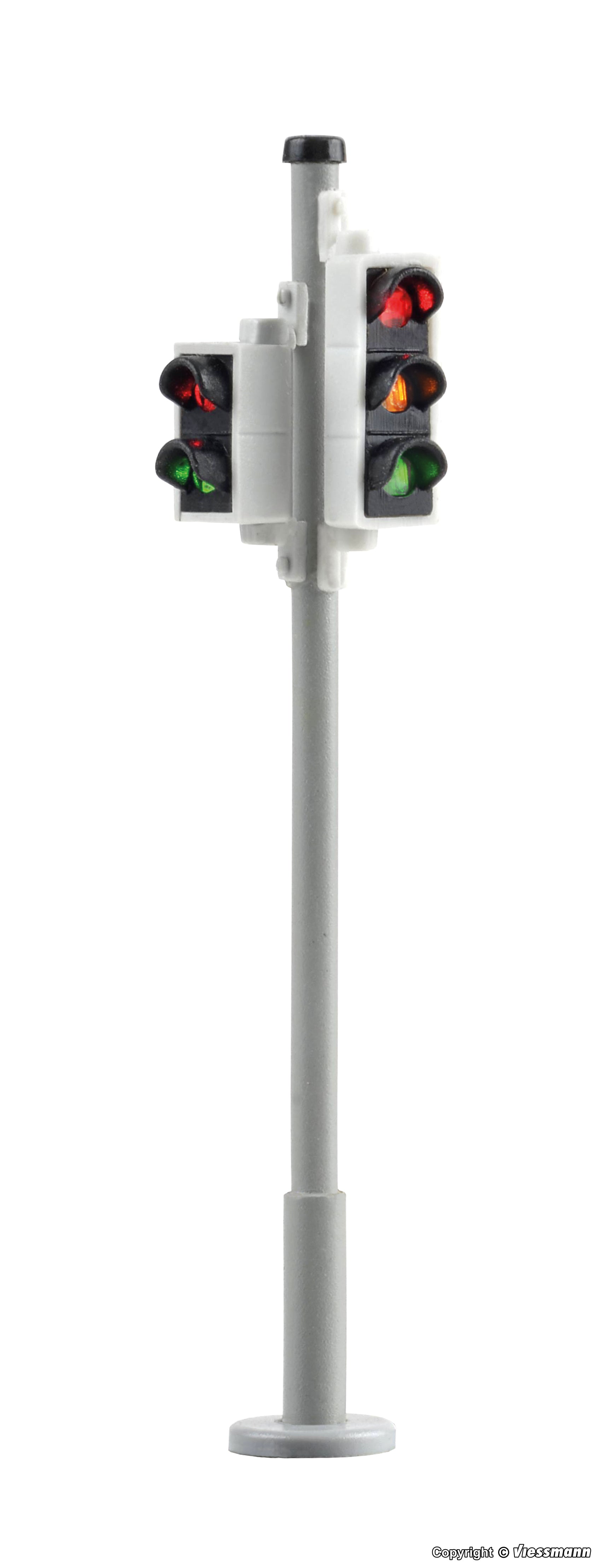 Traffic lights suitable for epochs III - VI. Each set contains 2 traffic lights, each with a red, yellow and green LED for road traffic and a red and green LED for pedestrians. Suitable for crosswalks as e. g. zebra crossings. Prototypical filigree brass mast with base socket for easy mounting. Maintenance-free by LED lighting. Attached electronics controls both traffic lights in an automatic sequence.