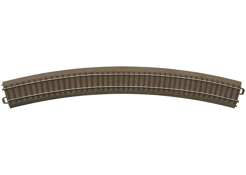 Trix curved H0 track with a radius R5 of 643.6 mm / 25-5/16". Curve 30°. Parallel curve to Radius R4 with a spacing of 64.3 mm / 2-9/16". 12 sections of track form a circle with an outer diameter of 133 cm / 52-3/8". The plug-in connection with the "Click". Set up and take down in a jiffy. Sturdy and long lasting.