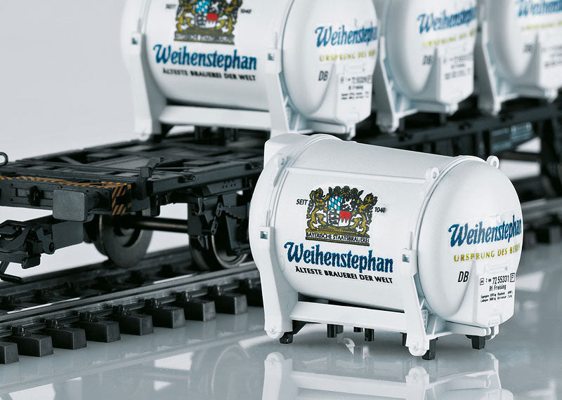 Model: The car has high-efficiency buffer beams and inset grab irons. It is loaded with 5 removable beer containers. The beer containers are painted and lettered for the Bavarian State Brewery Weihenstephan and are extensively imprinted. All of the containers have different registration numbers. Restraints for mounting the beer containers on the transport car are included.