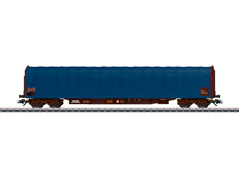 Prototype: Type Rilns four-axle sliding tarp car with a blue tarp. SBB/CFF/FFS Cargo sliding tarp car. European standard design with a length of 19.90 meters / 65 feet 3-7/16 inches. Version with rectangular buffers.
